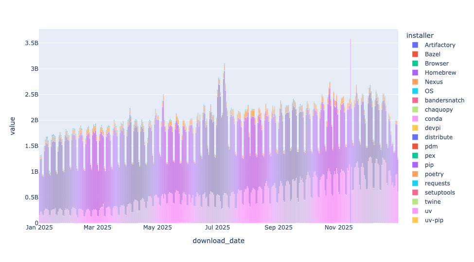 The uv package manager has become extremely popular over the last year. (I've even created a free 15-part e-mail course, which you can take at https://uvCrashCourse.com.) I'm curious to know if uv has improved its market share over the course of the year. Read the per-day, per-installer data into a Pandas data frame. Create a stacked bar plot showing the proportion of downloads used by each installer. Do you see an obvious increase in the use of uv? Is there a percentage increase in uv over time?