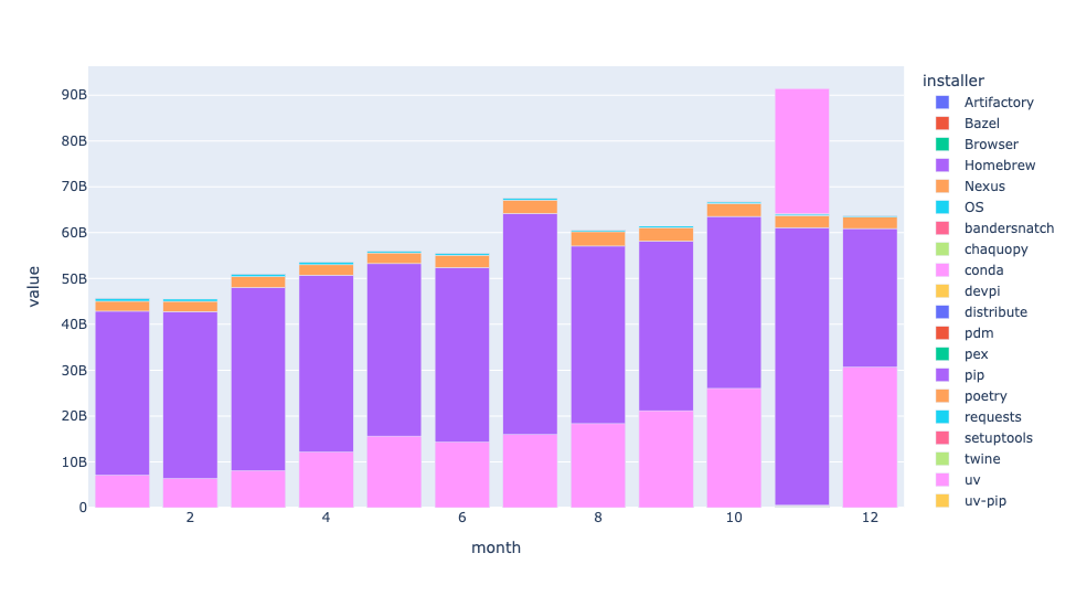 We can see that in January, uv was less than 15 percent of downloads from PyPI. By the end of the year, it was more than 30 percent of all downloads.