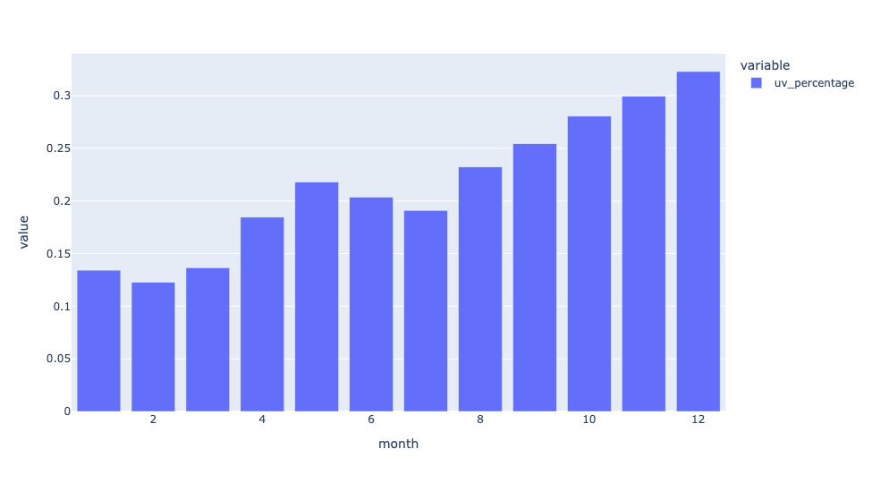)I then used assign to create a new column, uv_percentage, dividing the values in the uv column into the values in the All column. That gave me the percentage of total downloads executed by uv. I grabbed that column with [], and then invoked px.bar via pipe: