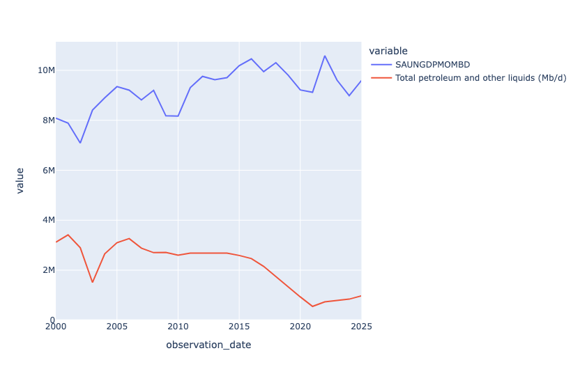 saudi_oil_barrels_url = 'https://fred.stlouisfed.org/graph/fredgraph.csv?bgcolor=%23ebf3fb&chart_type=line&drp=0&fo=open%20sans&graph_bgcolor=%23ffffff&height=450&mode=fred&recession_bars=off&txtcolor=%23444444&ts=12&tts=12&width=1320&nt=0&thu=0&trc=0&show_legend=yes&show_axis_titles=yes&show_tooltip=yes&id=SAUNGDPMOMBD&scale=left&cosd=2000-01-01&coed=2025-01-01&line_color=%230073e6&link_values=false&line_style=solid&mark_type=none&mw=3&lw=3&ost=-99999&oet=99999&mma=0&fml=a&fq=Annual&fam=avg&fgst=lin&fgsnd=2020-02-01&line_index=1&transformation=lin&vintage_date=2026-01-14&revision_date=2026-01-14&nd=2000-01-01'