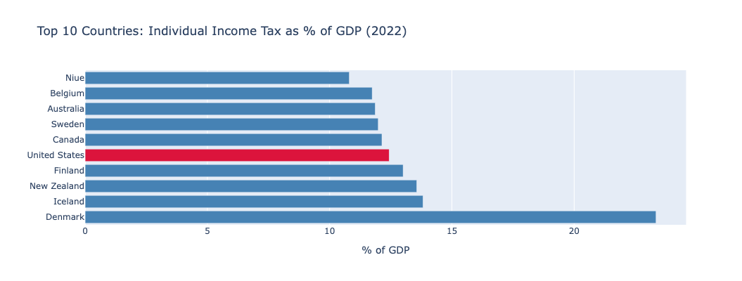 ## US Individual Income Tax vs. the World (2022, % of GDP)