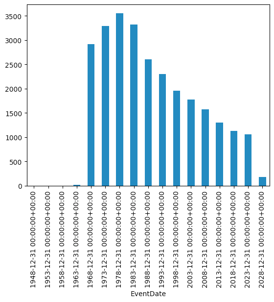 )I asked you to look at every 5-year period in the data set. That'll require more than a simple groupby; that would work on each year, or even each month. We'll need to use resample, which only works on a time series – that is, when the index is a datetime. So we'll use set_index to move EventDate to the index, and then run resample with a period of 5YE (i.e., end of every 5 years).