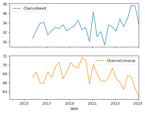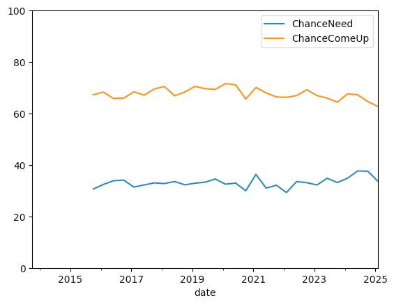 A common question to ask people about their financial security is whether they could come up with a certain amount of money, given the need. Questions N24 and N25 in the survey ask participants to indicate the percentage chance that they would have an unexpected $2,000 expense in the coming 12 months, and also the percentage chance that they could come up with $2,000 if they needed to. Using the `overall` data frame, produce a line plot comparing these values over the course of the data set. What does this indicate? If we use subplots, does the clarity of the plot change? Does setting the y axis to be 0-100, rather than set automatically, change our interpretation?