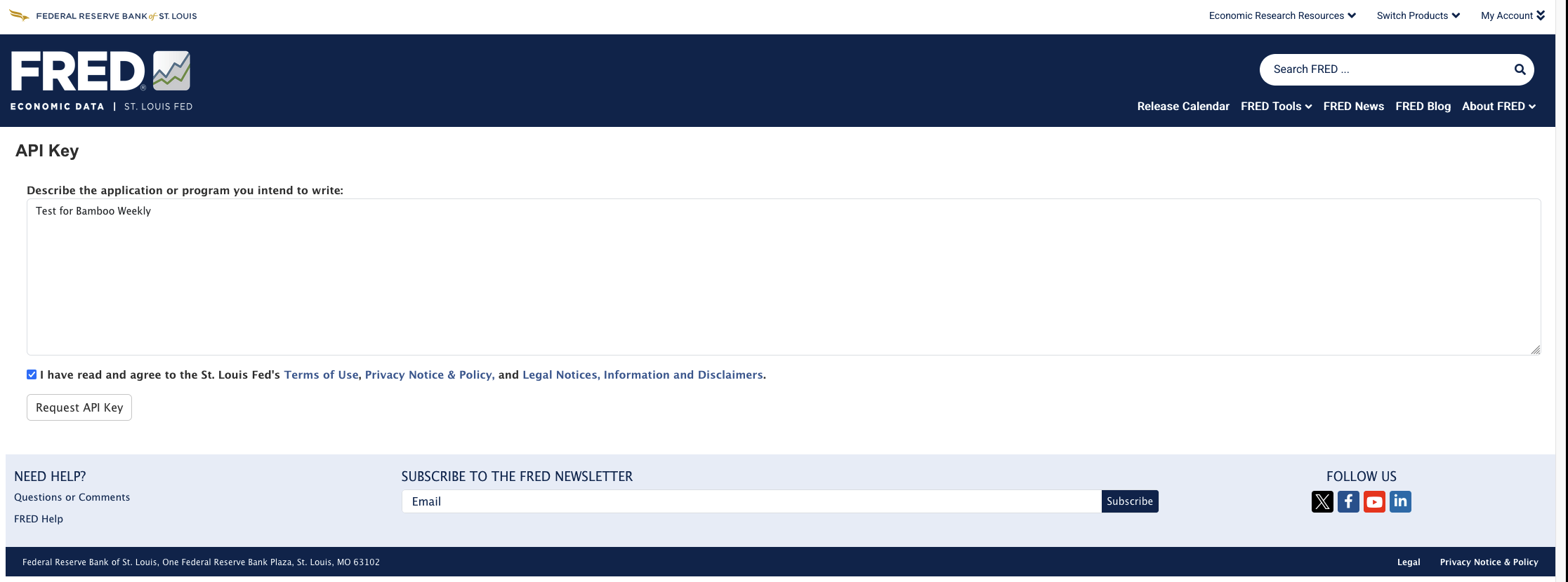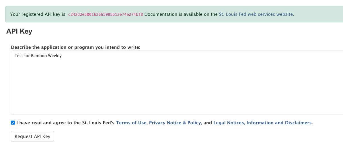 Once you have done that and signed in, then you can go to https://fredaccount.stlouisfed.org/apikey and request an API key: