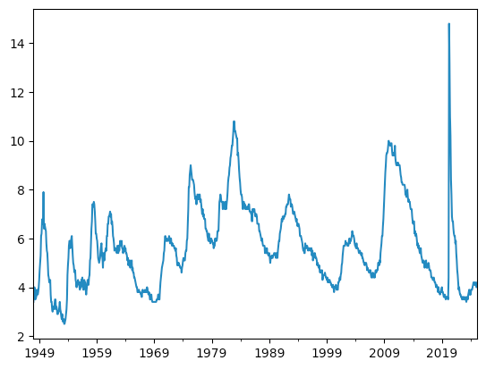 s = fred.get_series('UNRATE')In other words, I used open to open the file for reading, read the entire thing into memory as a string, ran str.strip to remove any leading/trailing whitespace, and assigned the result to the same variable, fred_api_key. Even if I share my Jupyter notebook with other people, I don't have to worry that they'll be able to use my key.