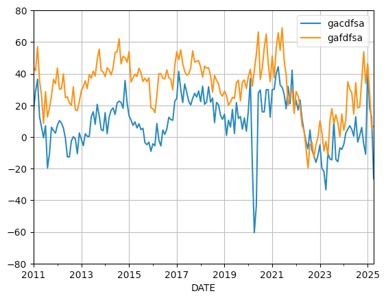 )Finally, in order to make the grid match the one that we saw in the Philadelphia Fed report, I passed the ylim keyword argument to plot.line, giving a tuple of minimum and maximum y values. I also asked for grid=True, so that we would have a light grid in the background: