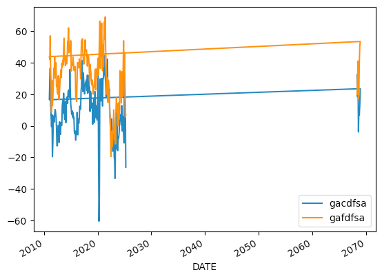 DatetimeIndex(['2068-12-01', '1969-01-01'], dtype='datetime64[ns]', freq=None)I'm willing to ignore the data from 1968, but that means we'll need to cap our loc in the current year (2025), just to be sure that we aren't getting weird data from the pseudo-future. In order to do that, we'll need to first invoke sort_index, since the slice on years won't work if the years are out of order, and the 2068 dates (!) are currently at the top of the data frame: