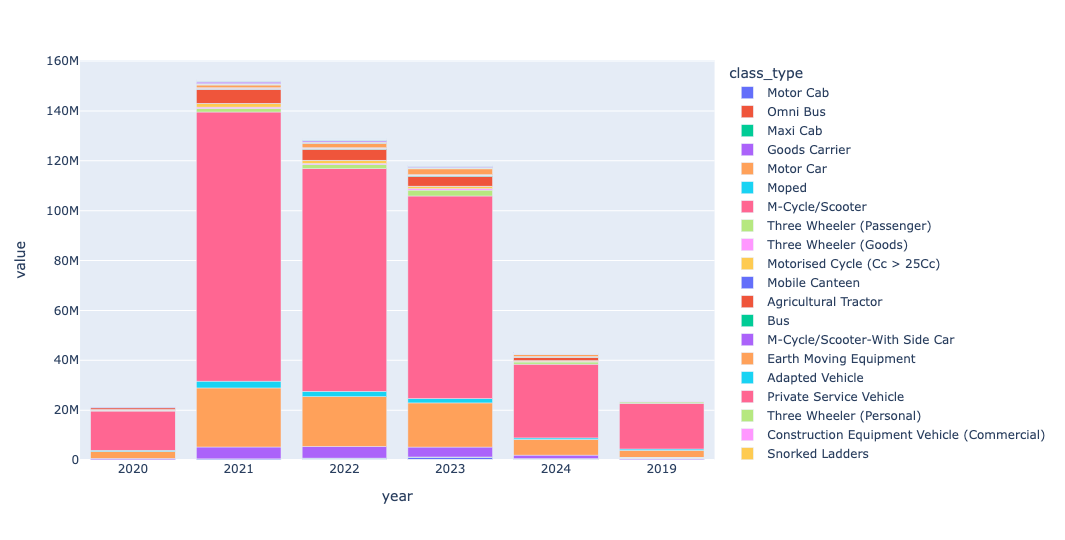 Load the "vehicle class" data into a Pandas data frame. Transform it into a data frame in which the rows represent years and the columns show the number of new vehicles of each class registered in that year. Using Plotly, create a stacked bar plot with one bar per year. Have overall vehicle registrations gone up each year? Do we see any trend?