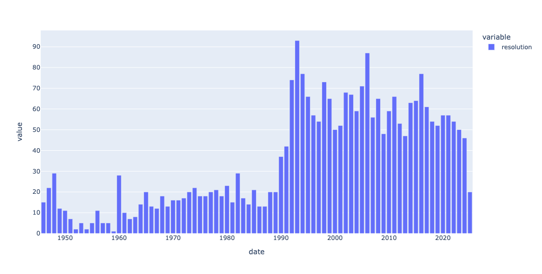 Read the UN vote data into a Pandas data frame. Make sure that the date column is treated as a datetime value. Create a bar plot indicating how many UN Security Council resolutions were brought to a vote in each year. Is there some point in time that indicates a big change in the number of resolutions per year?