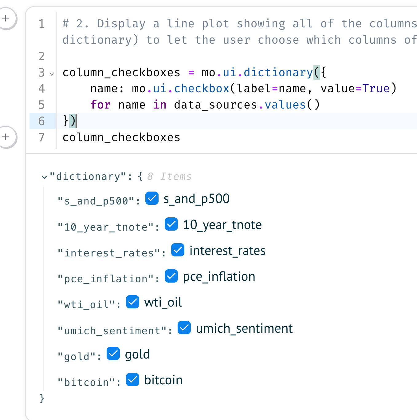 )But this displays a line for all of the columns in the data frame. I wanted to use Marimo's UI elements to create checkboxes allowing me to turn each of the lines on and off. How could I do that?