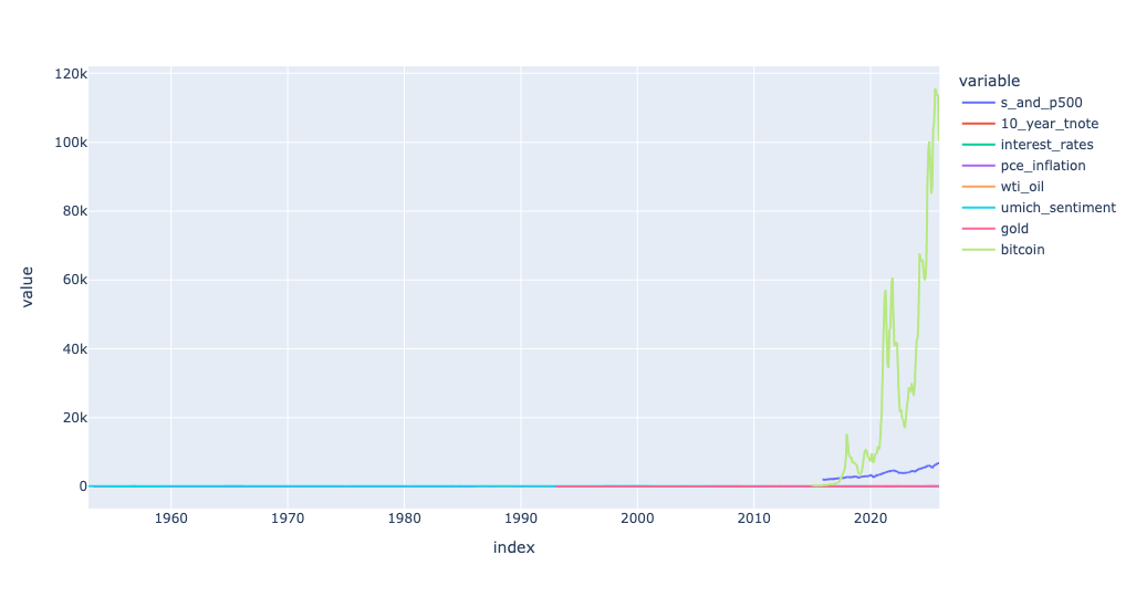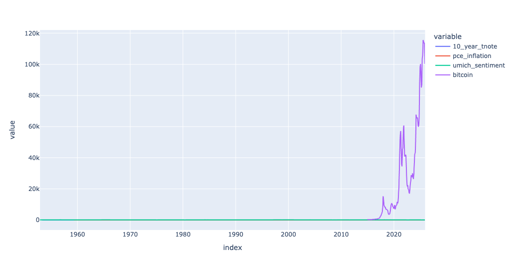 'CBBTCUSD': 'bitcoin'}The Fred API includes a get_series method that takes a data-source key (e.g., 'SP500'), retrieves the appropriate data from Fred, and returns a Pandas data frame. I used a list comprehension to invoke get_series once on each of the keys in this dict: