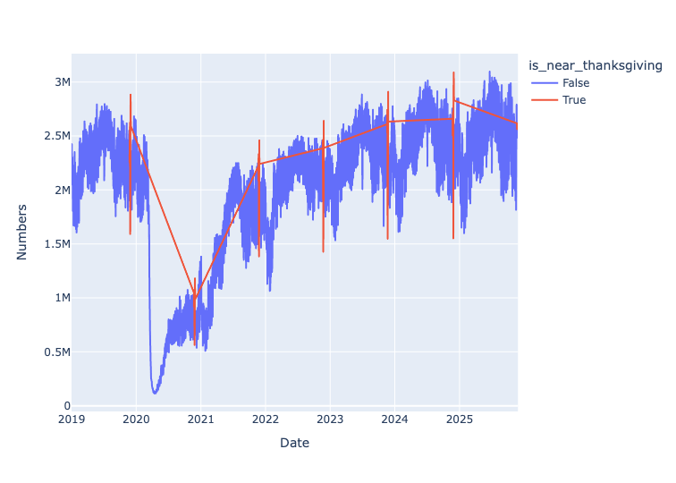 Plotly drew a separate red line, which isn't quite what I had in mind, but was good enough for our purposes. And you can see that when it around Thanksgiving, we see a real pop in travel just before... and then a real decline on Thanksgiving Day itself. Which matches what many people see, namely less traffic on Thanksgiving but a real upswing just before.