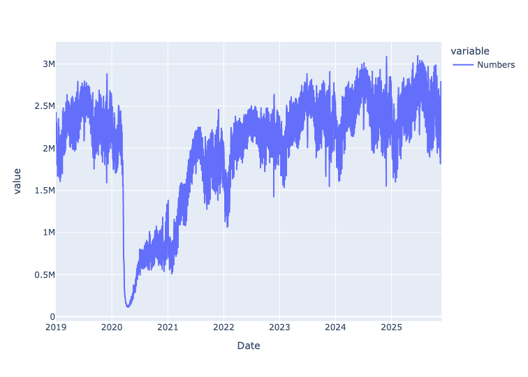 You can see the dramatic drop in air travel at the start of 2020, when the covid-19 pandemic started and shut down most travel. More people are flying, at least in the US, in 2025 than were before the pandemic, but it has taken a few years to fully recover from that shock.