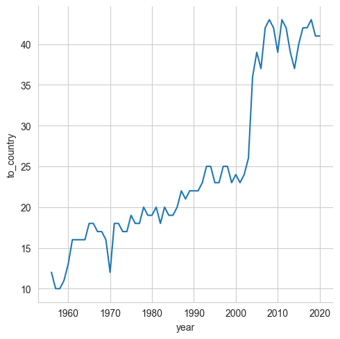 sns.relplot(data=df.groupby('year')['to_country'].count(), kind='line')Notice that we need to tell Seaborn that the data will come from our groupby, by passing the keyword argument “data”. And yes, it’s just fine to pass a series here, and Seaborn will do the right thing, treating the index as the values for its “x” axis and the counts as its values for the “y” axis.