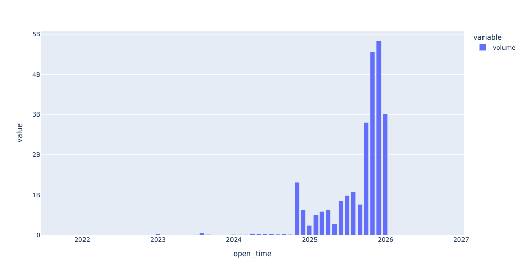 I thus asked to see the sum of volume for each one-month period in our data set. Then I used pipe to invoked px.bar, giving me a bar plot: