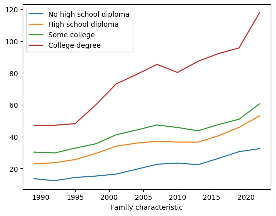 Create a line plot with a separate line for each educational level, the x axis representing years, and the y axis showing median income in 2022 dollars. Which level of educational achievement appears to be improving its mean income level the most over the years?