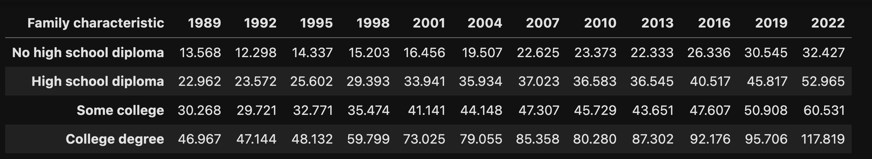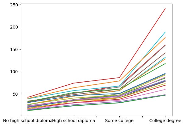 I wanted to see a line plot showing the median income for each educational level, with the x axis showing the progression of years. The idea is that we would be able to see whether, over the years, median income had improved or declined for each educational level.