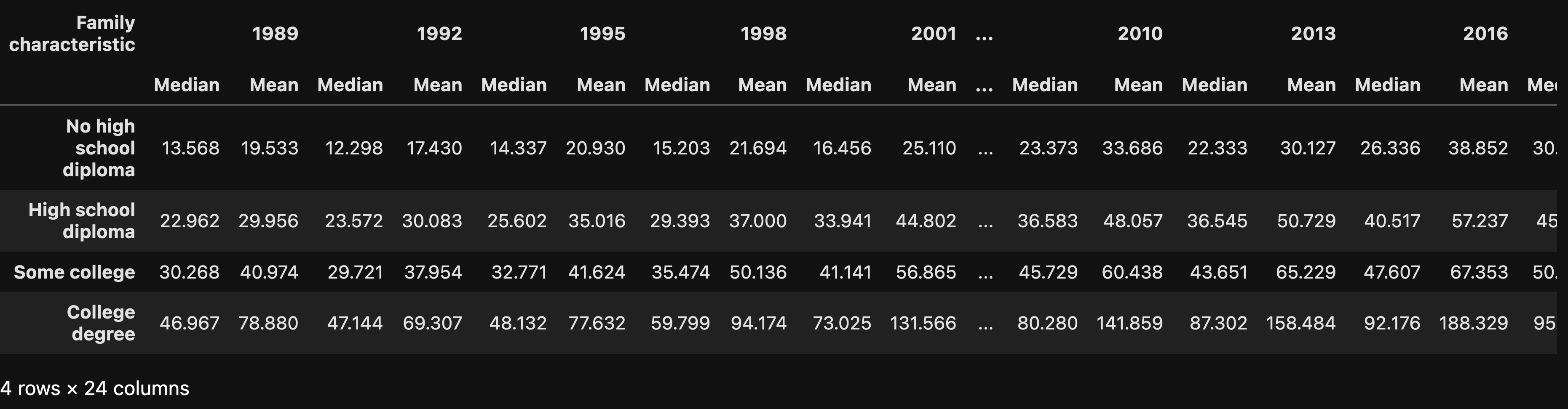 df = pd.concat(all_dfs, axis='columns')After doing all this, I got a data frame with 4 rows and 24 columns — 2 columns (mean and median) for each year of the survey.