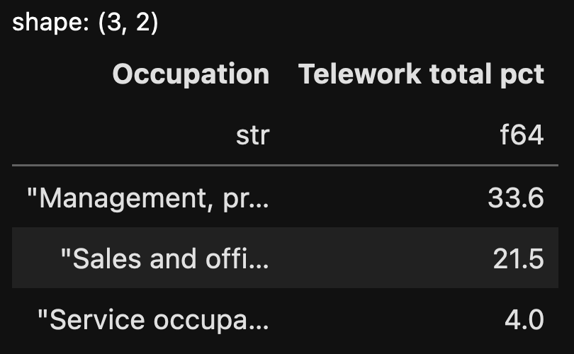 Use Polars to retrieve the Excel file for September 2023. We're interested in the data from Table 2, showing the percentages of people working from home with different occupations. This means that we'll want the subset of the spreadsheet from G11 to K39. Rename the columns to something easier to remember and understand.