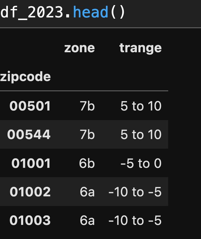 index_col='zipcode')Here’s what the start of the 2023 data frame looks like:
