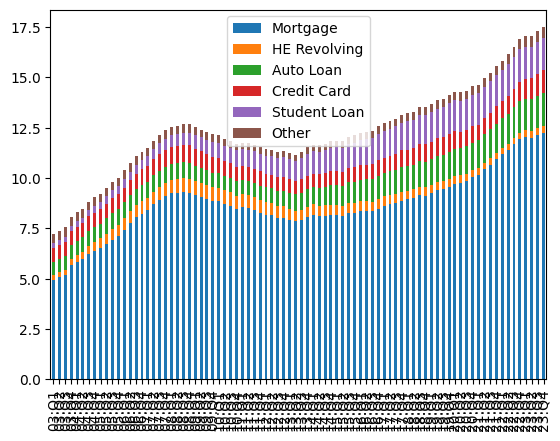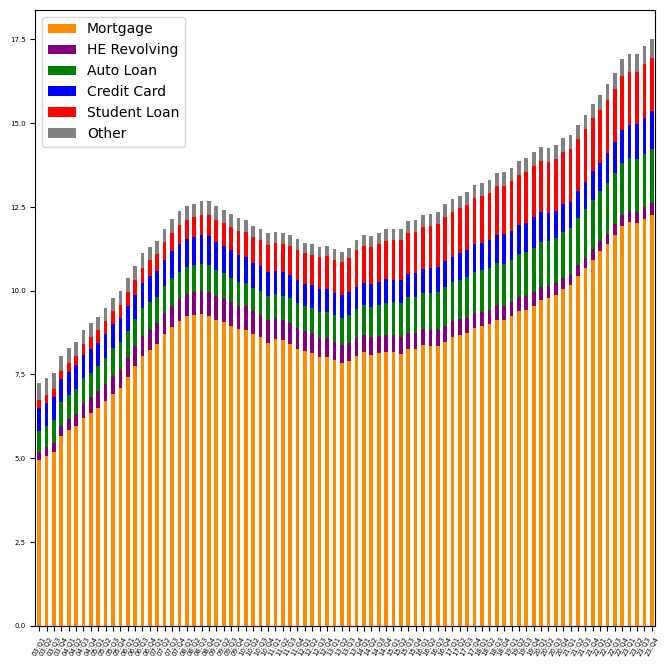 The chart on page 3 shows a stacked bar plot, indicating the contribution that each type of debt adds to the overall US consumer debt picture. The index of that data frame represents quarters, in the format of “YY:QN”, using the final two digits of each year and numbers 1-4 for the quarters.