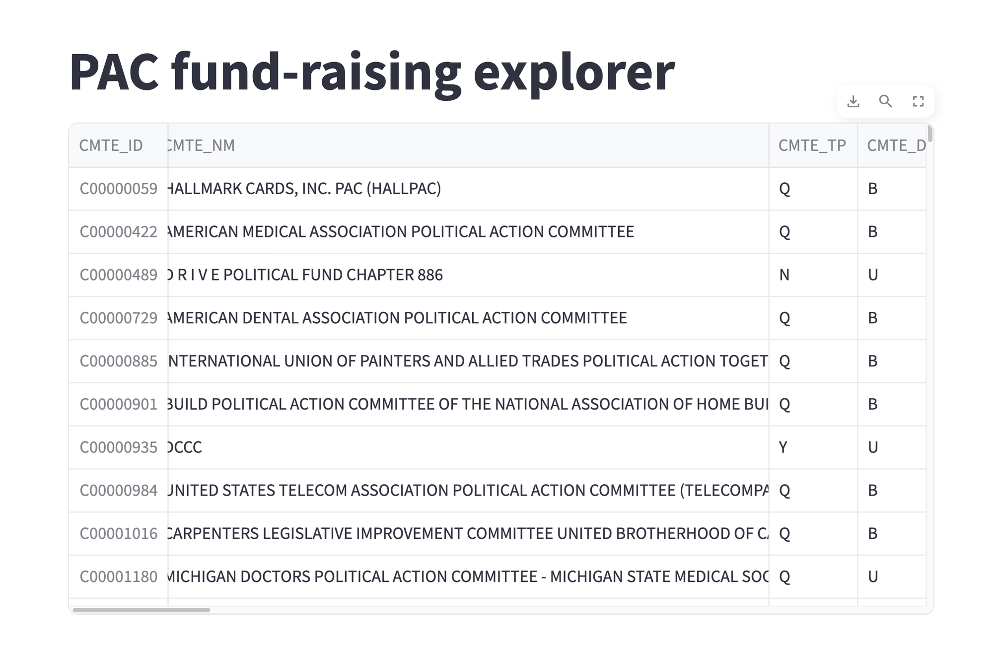 Create a Streamlit app that displays this data frame, in its entirety. Have a title (e.g., "PAC fund-raising explorer") at the top of the page.